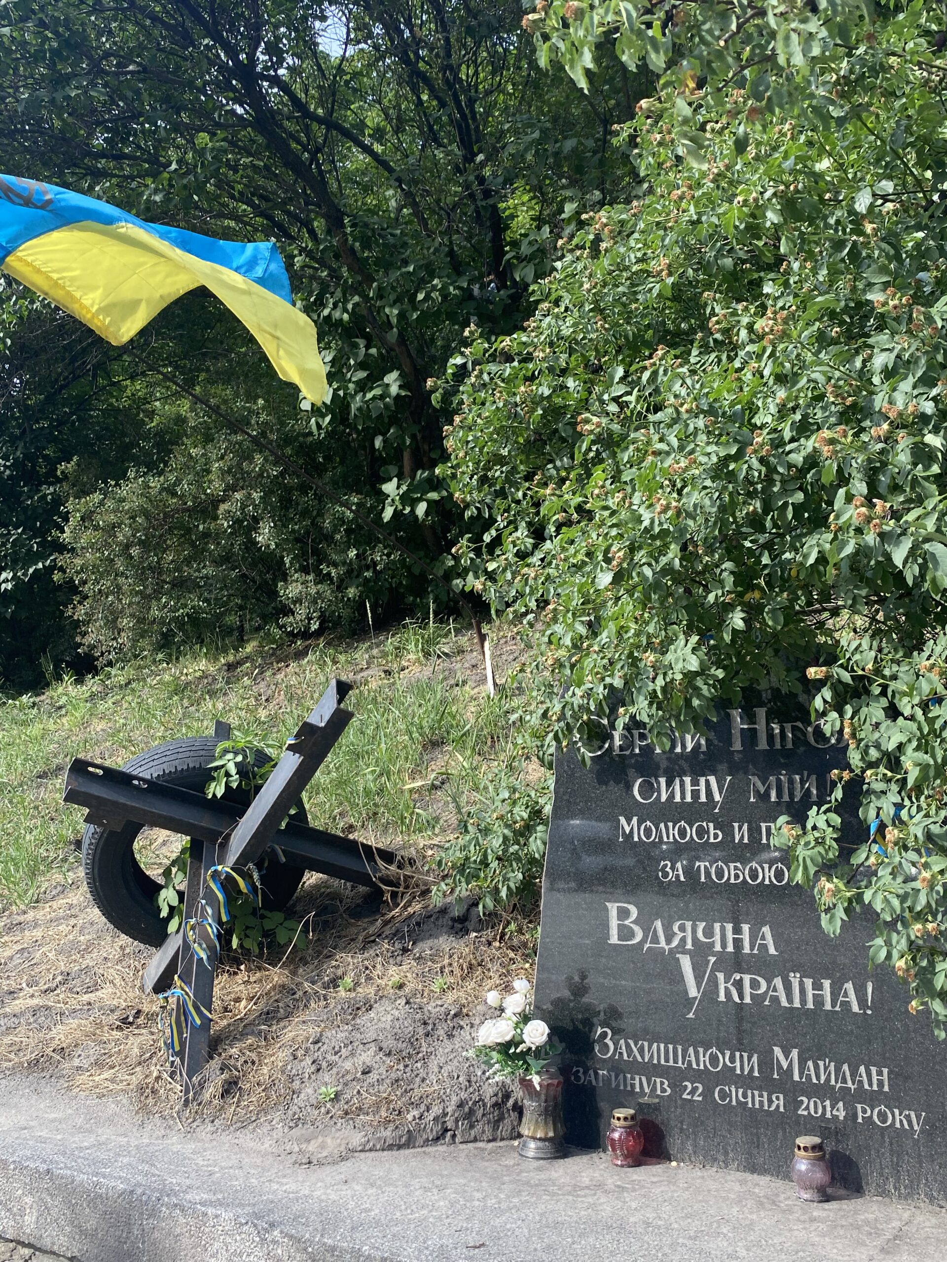 Maidan… beh. Non c’è molto da dire. Avevo visitato questa piazza per la prima volta quando avevo otto anni, nel 2006. Due anni dopo la Rivoluzione Arancione. Non capivo molto, ma mi piacevano quelle bandierine. Ora le bandierine non mi piacciono più perché rappresentano i soldati caduti in questa guerra. E come se non bastasse la potenza di questa scena, noto un soldato che firma un’altra bandiera – un’altra morte – e piange per il compagno caduto nella stessa battaglia combattuta insieme, ma con esiti diversi. Non riesco ad andare oltre. È troppo intenso. Riesco solo a sfogare il mio dolore tramite le lacrime, accovacciata sulle scalinate della piazza.