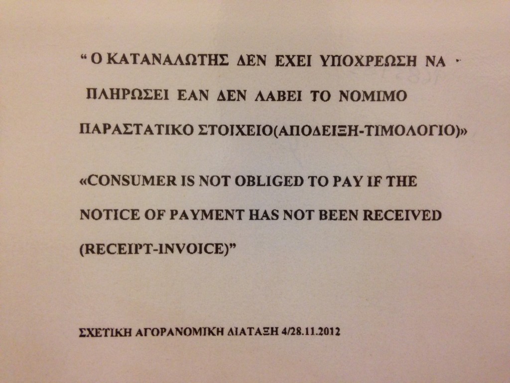 Una volta entrate in vigore le nuove misure finanziarie, sarà difficile avere una risposta se questi privilegi verranno conservati. Di sicuro, però, è alla popolazione, isolani e continentali, che viene riservata la facoltà di azione. “Il consumatore non è tenuto a pagare se la notifica del pagamento non è stata consegnata (scontrino – fattura)” è un affisso obbligatorio (in greco e in inglese) nei bar, ristoranti ed esercizi commerciali dove è obbligatorio battere lo scontrino. Un provvedimento tramite una circolare ministeriale 4/28.11.2012 che ha l’aria da lotta all’evasione fiscale tramite un incentivo al consumatore stesso, quasi a insegnargli che è sempre lui il primo ad essere avvantaggiato o svantaggiato se le tasse vengono pagate o meno.