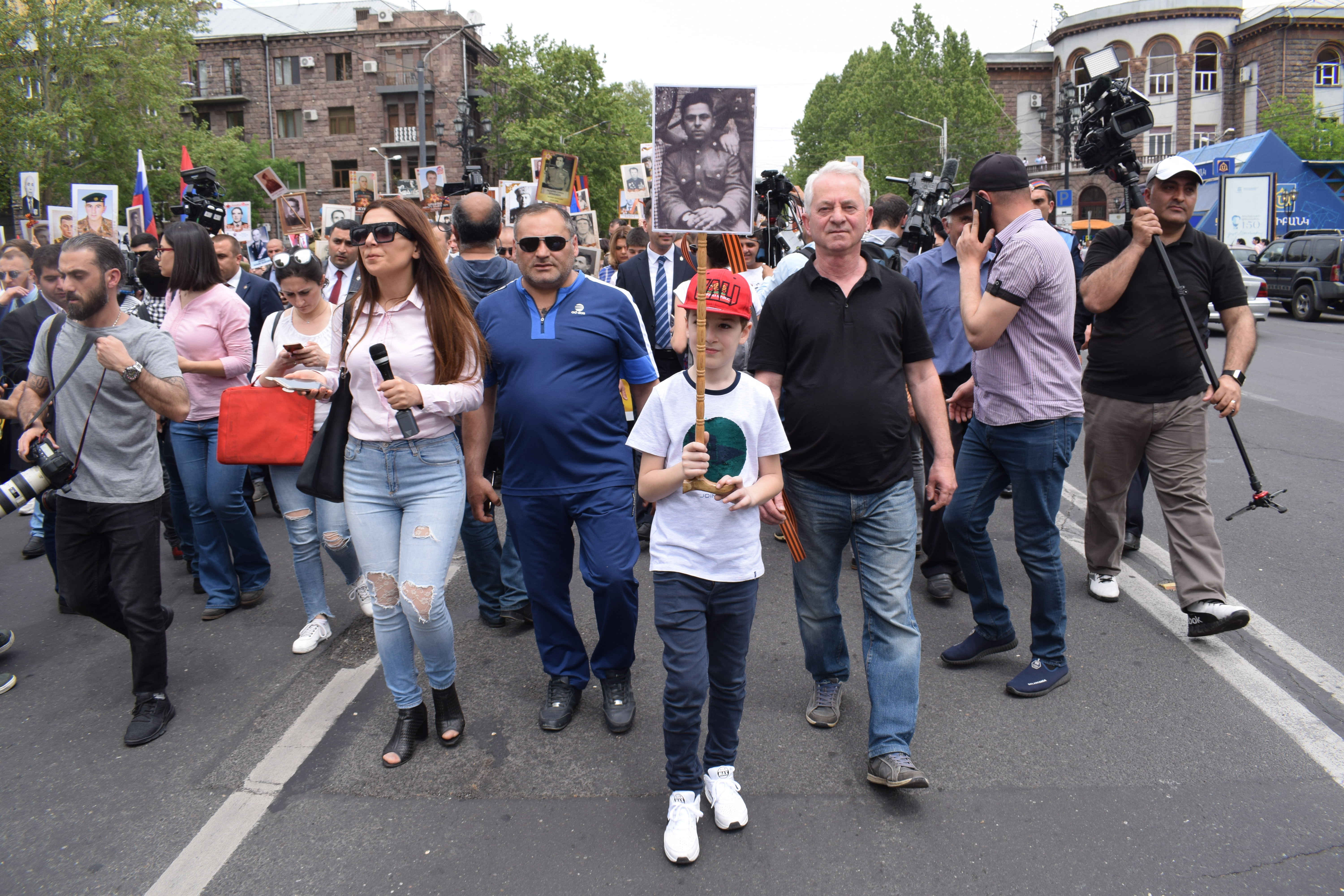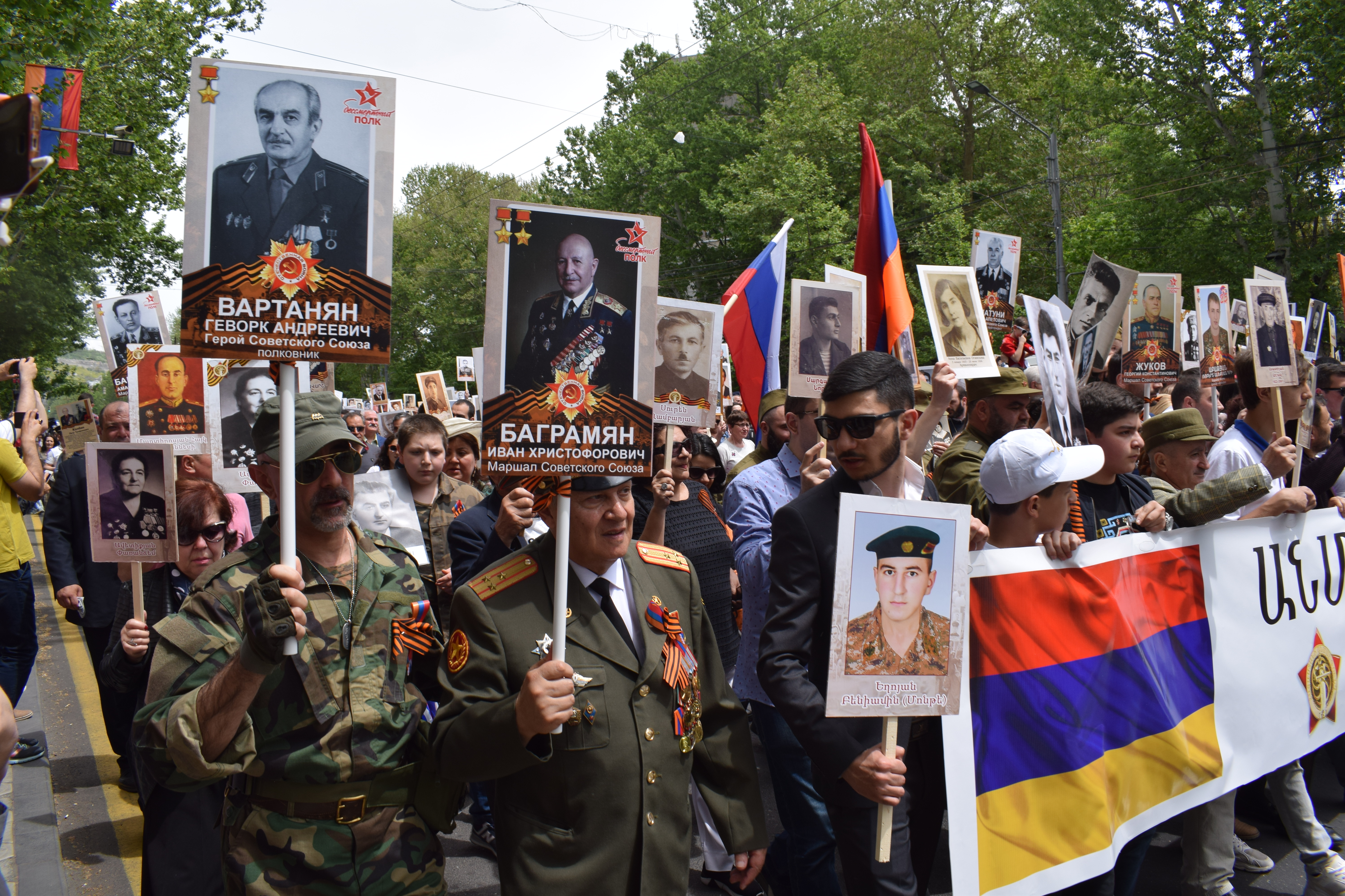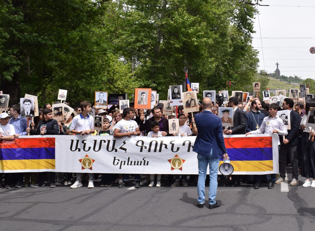Oltre ai militari, a vari corpi delle forze dell’ordine e ai rappresentanti dello stato, il grosso del corteo che ha sfilato per le vie di Erevan era costituito da gente comune, che ha preso parte alla sfilata del “Reggimento immortale”. Si tratta di un’altra iniziativa made in Russia (e dagli sviluppi controversi), che si è svolta in varie città dell’Armenia per il quarto anno consecutivo. Migliaia di cittadini hanno sfilato con in mano i ritratti dei propri genitori, nonni o bisnonni che hanno partecipato alla Seconda Guerra Mondiale.